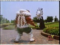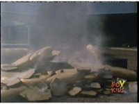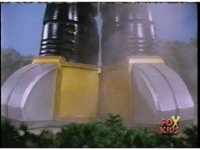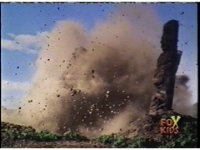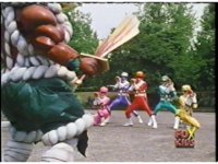 Fishface talks, turns, fires his blast bag, and destroys the sunflower statue, debris raining down as Magna Defender shoves the Rangers aside. The monster then discovers the statue was empty. |