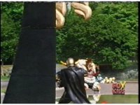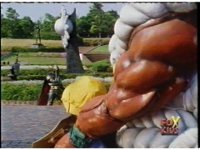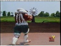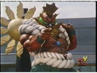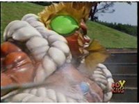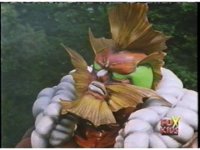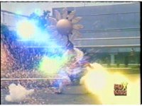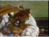 Fishface recovers, then leaps over near the sunflower statue, tosses his blast bag at it, destroying the statue, but once again, there was nothing inside of it, the monster collapsing after talking. |
