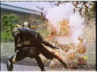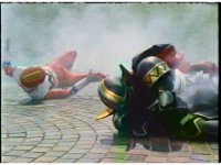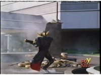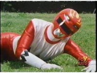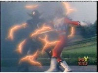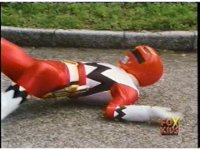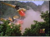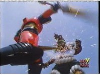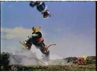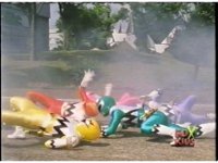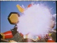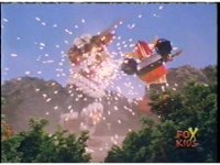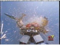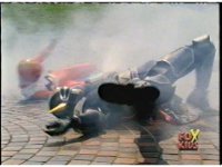The smoking Magna Saber slides across the ground, as Red & Magna Defender fall, smoking and writhing. |