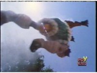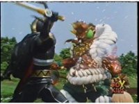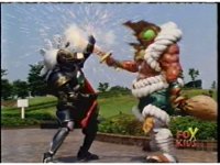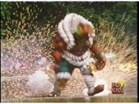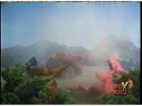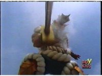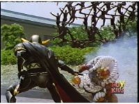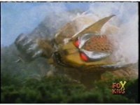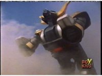 Fishface leaps up and kicks both feet into Galaxy Megazord, knocking it down, letting the monster come over and sparkily slash at it. |