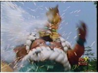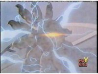 Fishface staggers back, then whips forth his fin blade, shooting energy at Mega Defender, who dodges the first one, but is spark bursted by the second, knocking him down. |