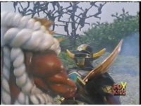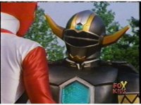 Magna Defender drops his sword, then turns and calls off Torozord, who backs off. The monsters then begin to sparkily slash the defenseless Defender, as Captain Mutiny laughs (shh!) |