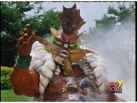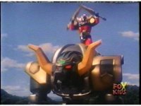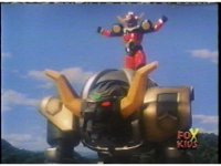 Fishface reacts, as Mega Defender turns around, poses, then leaps up, lands on Torozord's back, and takes the reins, causing him to roar. |