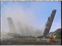 Pillars of stone begin to rise up out of the ground in two rows, sending dirt flying, the Rangers watching, as a figure becomes visible within the back of it. Green reacts, then Fishface quivers. |