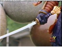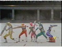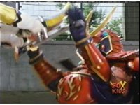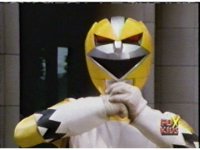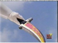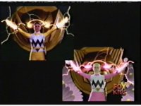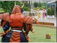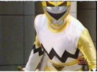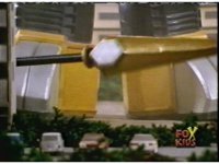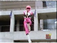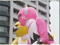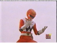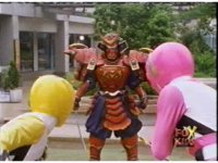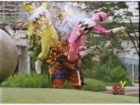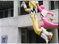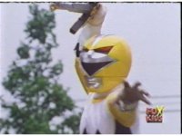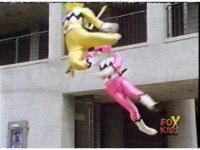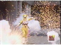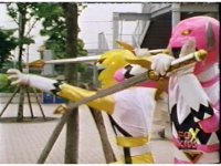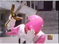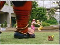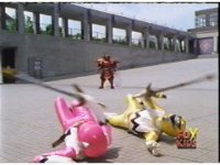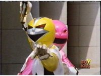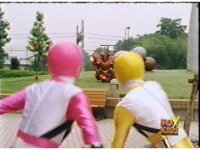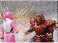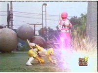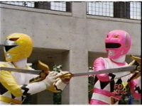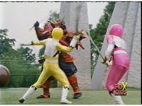Yellow leaps up, readies Magna Talon, thrusting both it and the Quasar Saber forth, keeping Destruxo's katana busy while Pink leaps up behind her, and sparkily slashes him with her own Saber, knocking him down. |
