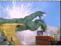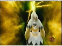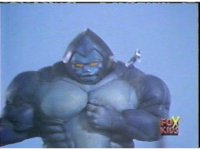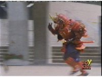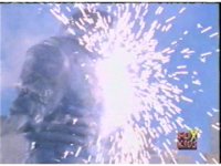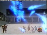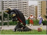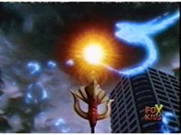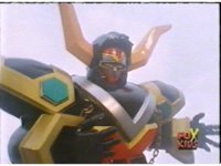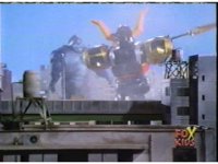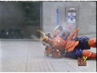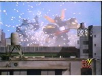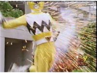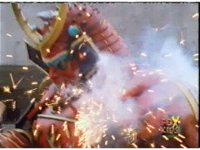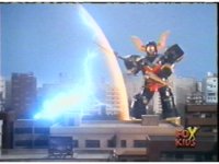 Continued from earlier, Defender Torozord sparkily slashes Gorilla, several times, until he falls. |