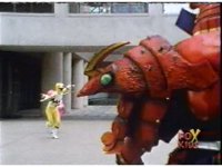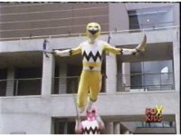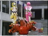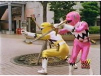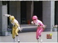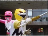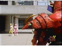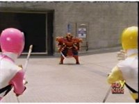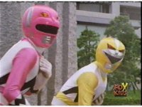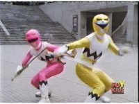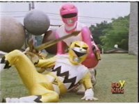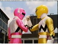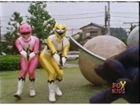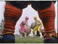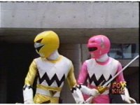Yellow, then Pink, charge up their Quasar Sabers and slash at Destruxo, who merely grabs both of the glowing blades in his hands, talks, then releases, sending the girls rolling back, into defensive positions. |