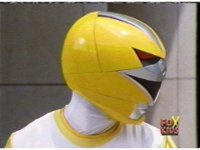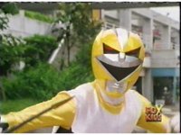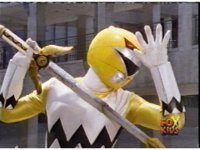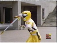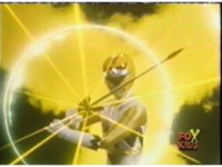 Yellow Galaxy Ranger charges up her Quasar Saber with yellow energy, yellow mist surrounding her, before she slashes it forth. |