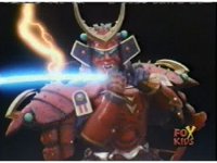 Yellow & Pink leap up and slash their Magna Talons at Destruxo, who blocks them with his katana, causing both to bounce off, where they then fire Beta Bows at him, but he slashes the energy arrows down sparkily. Pink reacts, then Yellow talks, raising a fist, before rushing forth. |