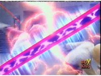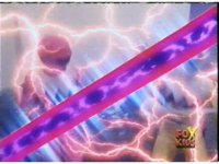 Yellow & Pink attack Destruxo, who blocks their attempts and sparkily slashes them back. He then does another pair of energy slices into the two, knocking them into the forcefield wall, then down. |