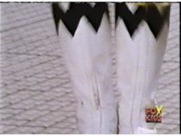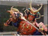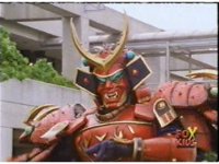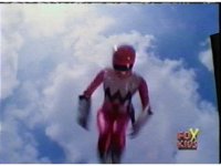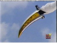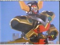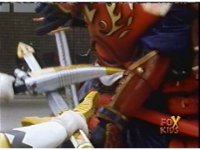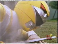 Defender Torozord agonizes, then crackles and flashes, breaking up into two blurs, one of which falls to the ground as the Magna Defender, clutching his chest. |