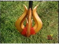 Destruxo impales speared staff into the grass. |