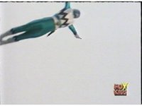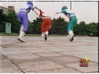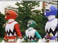 Red nod-talks, then leaps down, Green & Blue also jumping down, joining him in approaching Magna Defender, who gets up and staggers away, clutching his chest, until he leaps out of there, leaving the Rangers looking on and talking amongst themselves. |