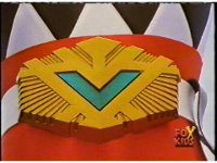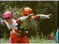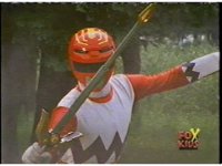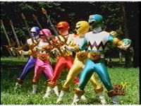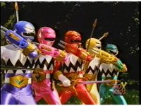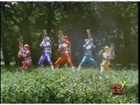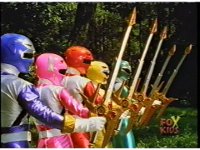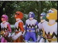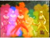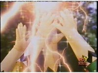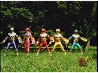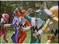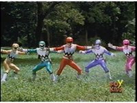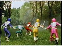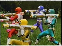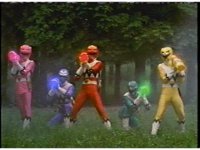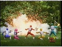 The ball of energy reverts to the five Rangers, posing, Red talking quickly and spreading arms. |