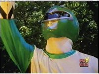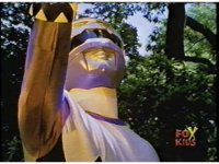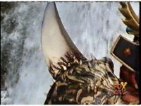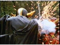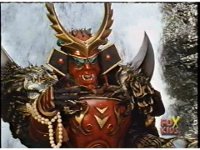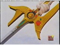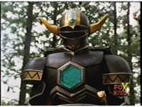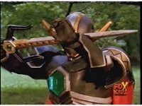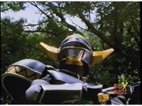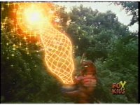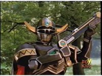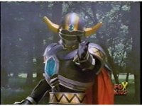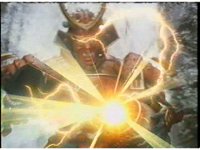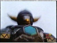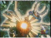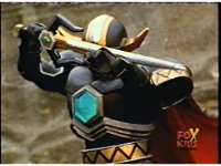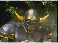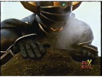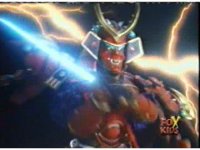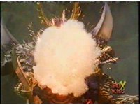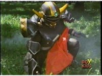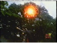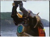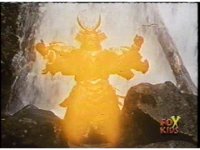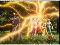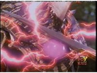 Magna Defender leaps up and does a somersault, repeated twice, while slashing down his sword, striking Destruxo's shoulder gem, causing him to crackle with electricity and glow golden, the Lights of Orion leaving his body and floating off where the Rangers gather beneath it as the wind whips about them. |