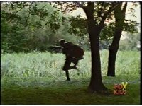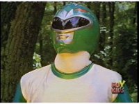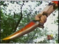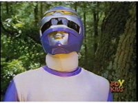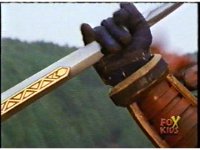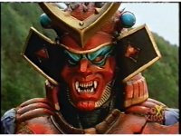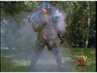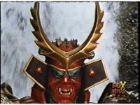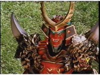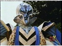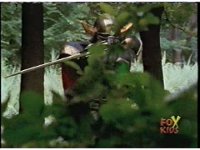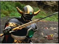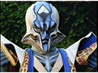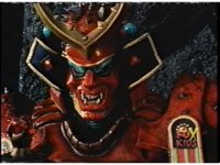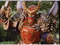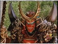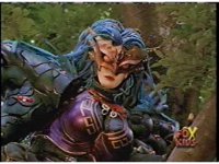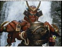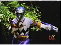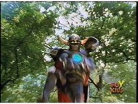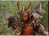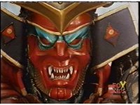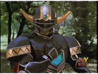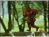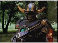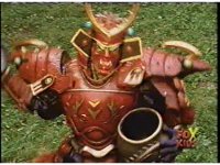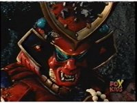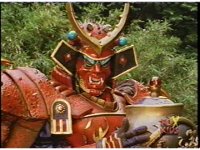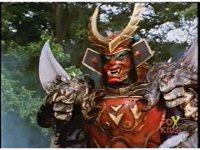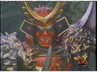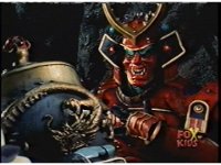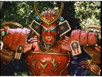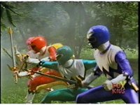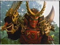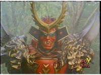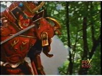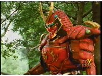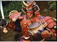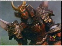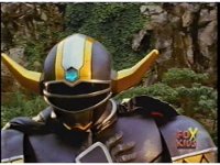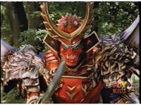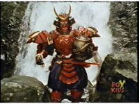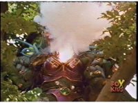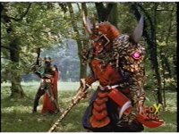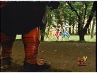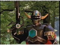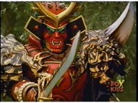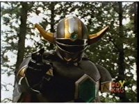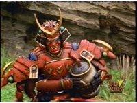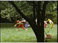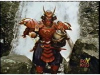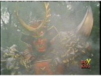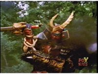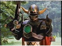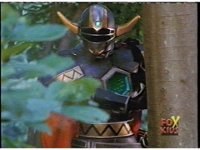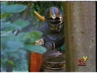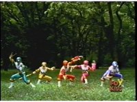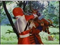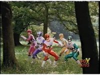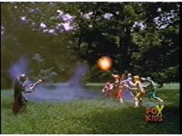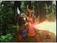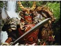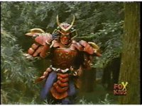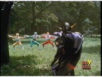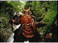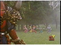 Destruxo appears from behind a tree, talking, the Rangers turn toward him as he suddenly charges forth with his katana held outward. |