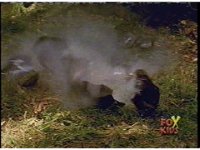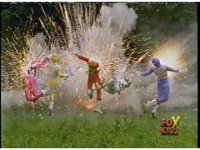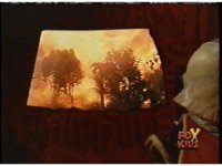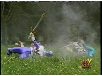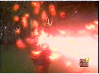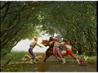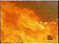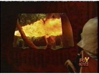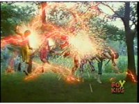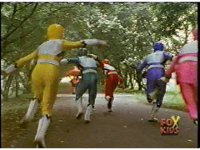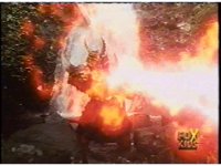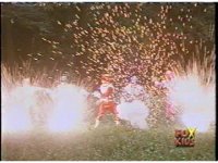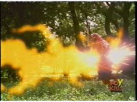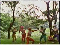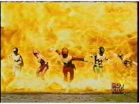 From out of a wall of flames, come all five Rangers racing from within the flames, unburned. Side angle on them as they quickly rush past the camera. |