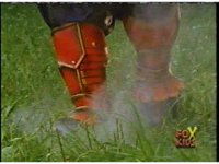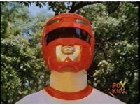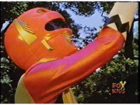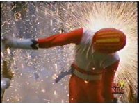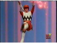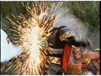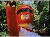 The Rangers finally reach Destruxo, who approaches while they pose. He talks, Red responds, remaining defensive. Destruxo charges up his sword and fires another flame stream forth, spark bursting the team down. |