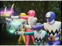 Green & Blue fire Transblasters, Pink & Yellow fire Beta Bows, at Destruxo, spark bursting before him, but he rushes through the smoke unharmed, heading for the defensive Rangers. |