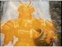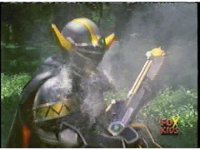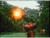 The five Orion Armored Rangers race forth, glowing, then merging into one bright ball of yellow energy, which rips through Destruxo explosively. |
