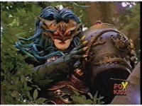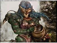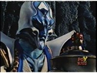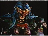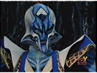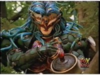 Destruxo raises his saber, then the snakehead spews black mist into his face, as the Rangers gawk. Destruxo doubles over, then notices Impostra up a nearby tree, talking. |