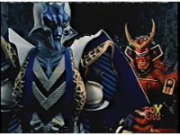 Magna Defender runs in, leaps up, slashes his sword forth, but Destruxo grabs the blade, and shoves him back, where he poses with his sword, as the monster unsheathes his katana. |