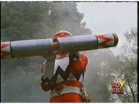 The Rangers whip their glowing Quasar Launchers onto their shoulders, and fire energy bursts forth. |