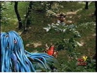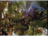 Impostra reacts, Magna Defender talks, then sparkily shoots her right in the boobs, knocking her down from the tree. She gets up, talks, then vanishes from the scene. |