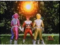 The Rangers pose, causing a flurry of golden sparkles to flash behind them. |