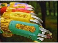 The Rangers fire their Quasar Launchers, nearly at once, colored balls of energy flying forth. |