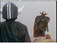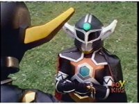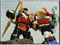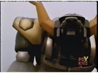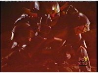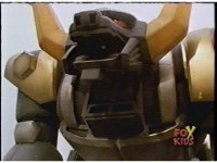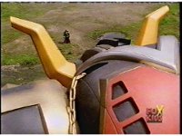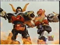Galaxy Megazord grabs Defender Torozord by the arm, Red nod-talking and wobbling, before DT talks back, then pushes GM away and sparkily slashes it in the chest. |