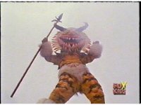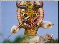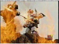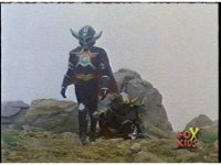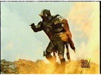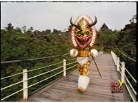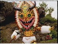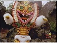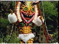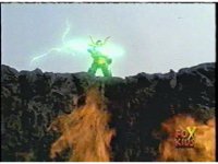 Freaky Tiki dances, then rushes forth, missing Galaxy Megazord, which then blocks his spear strike, sparkily kicks him, then gets its left hand gnawed on for a moment, before using it to fling the monster into the air, landing beside the mouth of the volcano. |