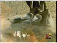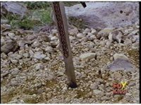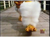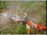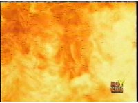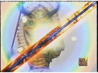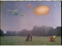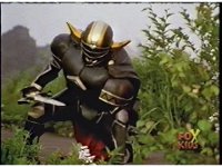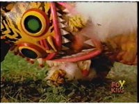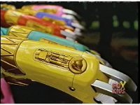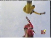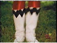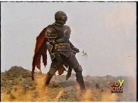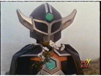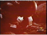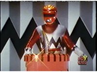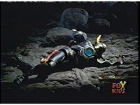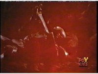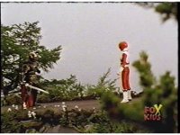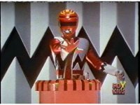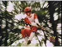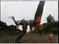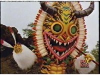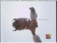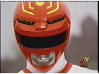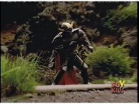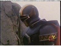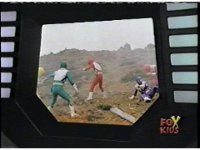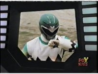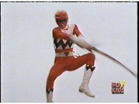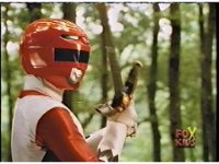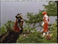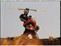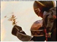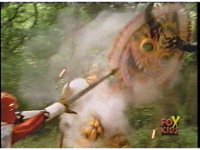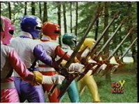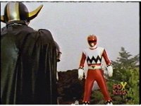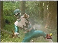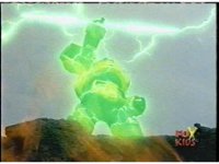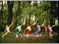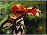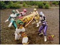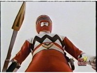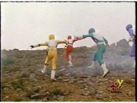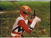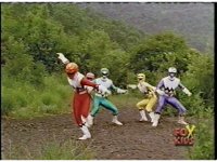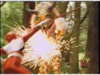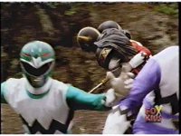 Freaky Tiki sparkily slashes each of the four Rangers, but Green recovers, leaps up, and gets sparkily slashed down again. Red arrives, pulls out his Quasar Saber, and sparkily slashes the monster down. |