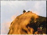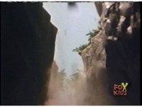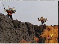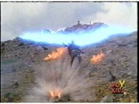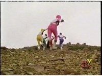 The Rangers leap over the camera and rush up the mountain side, suddenly stopping before ripples of energy pulsate out from the peak, causing explosions to erupt around them. |