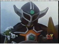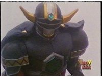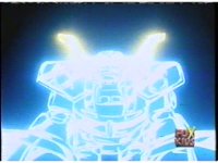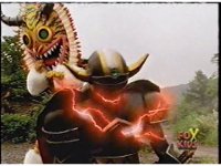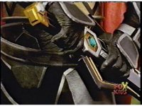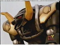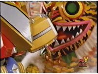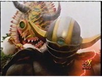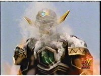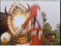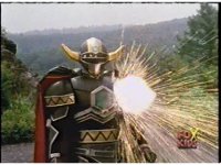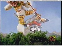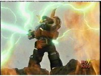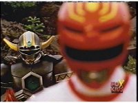 Torozord fires eyebeams down upon Magna Defender, causing him to grow gigantic and transform into Mega Defender mode. |