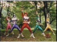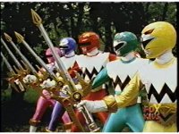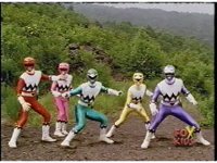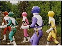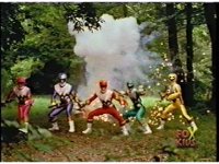 The Rangers regroup before the smoking Freaky Tiki, and do the group Lights of Orion activation gestures. |