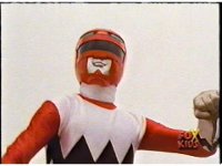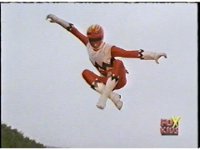 Red reacts and rushes forth, Freaky Tiki tosses explosive feathers at him, they dust burst around him, but he presses on, leaps up, whips out his Quasar Saber, and sparkily slashes the monster down. |