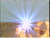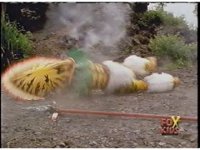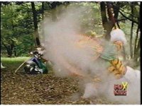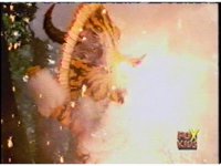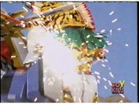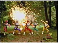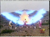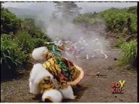Freaky Tiki charges forth, so the Rangers do the same, glowing, then merging into one bright ball of yellow energy, which rips through the monster explosively, coming out the other side and turning back into the Rangers. Freaky Tiki spark bursts brightly, and collapses, as the Rangers pose with their backs to him. |