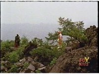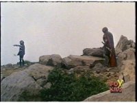 Magna Defender talks to himself, looking away, then he suddenly spots a vision of Zika, carrying flowers, walking forth across the field. He gets up and listens as his son talks and points away, talking back to him, as he ceases pointing and looks at him. |