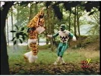 The Rangers regroup around the weary Magna Defender, as Freaky Tiki recovers angrily. Green talks to Red, who goes back and helps MD get up, aiding him in retreating, while the Rangers remain in defensive positions. Freaky Tiki picks up his spear, and begins to fight the four Rangers. |