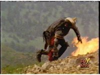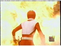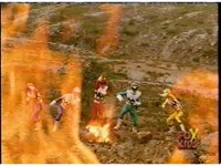 Red gets back up and tries to fight through the flames, while Magna Defender lurks in the background, talking to himself, glancing about, then collapsing onto his back, before another flame stream flies by, spark bursting around him, and exploding massively before the Rangers. |