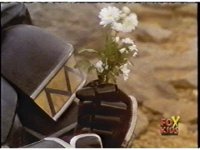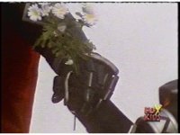 Magna Defender rests against the rock, Zika talks and bends down, handing him the flowers, which he accepts. |