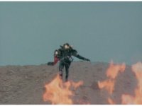 Magna Defender reaches the summit of the volcano, facing the flames, his body smoking profusely, as he drops the flowers. |