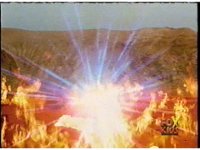 The shimmering ball reaches the flaming center of the volcano, causing a flash of light and growing dome of flames to rise. |