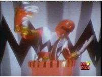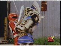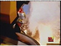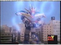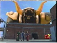 Torozord fires eyebeams down upon Magna Defender, causing him to grow gigantic and transform into Mega Defender mode. |