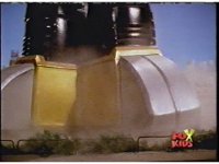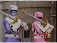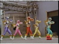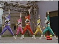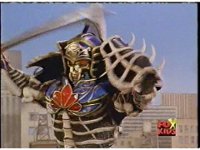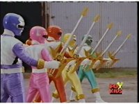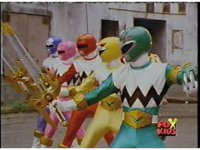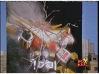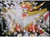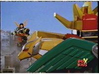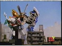 The head and horns pop out of the Lion section as it floats up, Wild Cat & Lion becoming arms, as all five Zords come together to form the Galaxy Megazord. |
