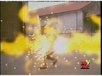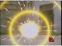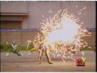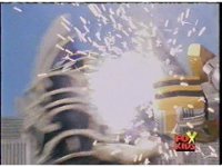 The Rangers charge forth, glowing, then merging into one bright ball of yellow energy, which rips through the monster explosively, coming out the other side and turning back into the Rangers, who turn to face Skelekron as he spark bursts brightly, collapses, and explodes massively. |