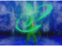 Red spreads his arms down, then raises his left arm forth, causing the armband gem to gleam green. |