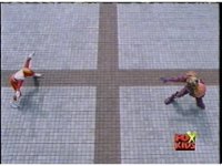 Red & Maronda block each other's punches, and grab each other's arms briefly, Red nod-talking, before they break off, pace about, then lunge at each other, Red grabbing her and flipping her over. |