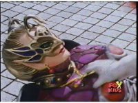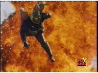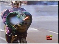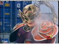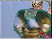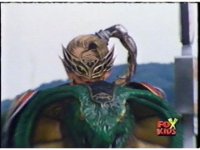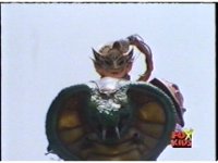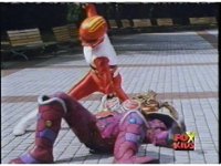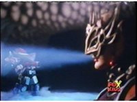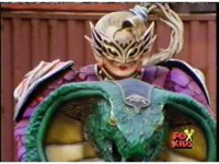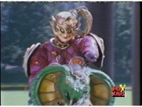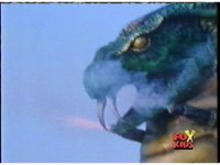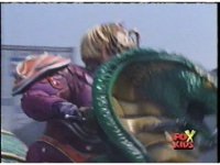 Maronda's massive head appears and blows super breath upon Galaxy Megazord until it spark bursts, and falls down, passing out of the serpenty dimension. |